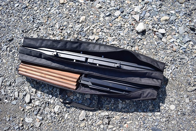 天板、フレーム、筋交いパーツ等をすべてを分解し、専用収納袋に収納することでサイズ縦 19cm x 横 86cm x 高さ 13cmのサイズで非常にコンパクトに収納可能です。