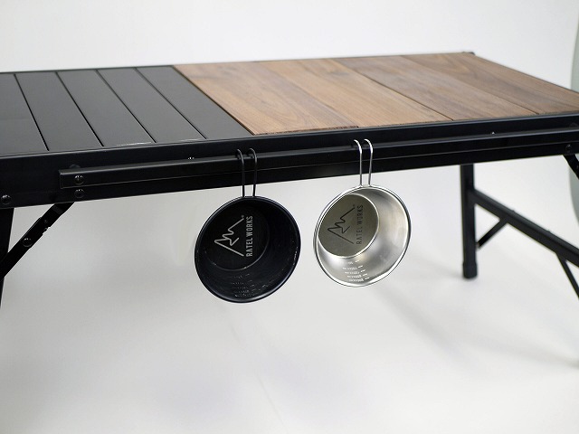 テーブルの片側にはレールが付いている為、シェラカップやS字フックを使えばスキレットや、グローブ、トングなどあらゆるものをかけておくことができます。