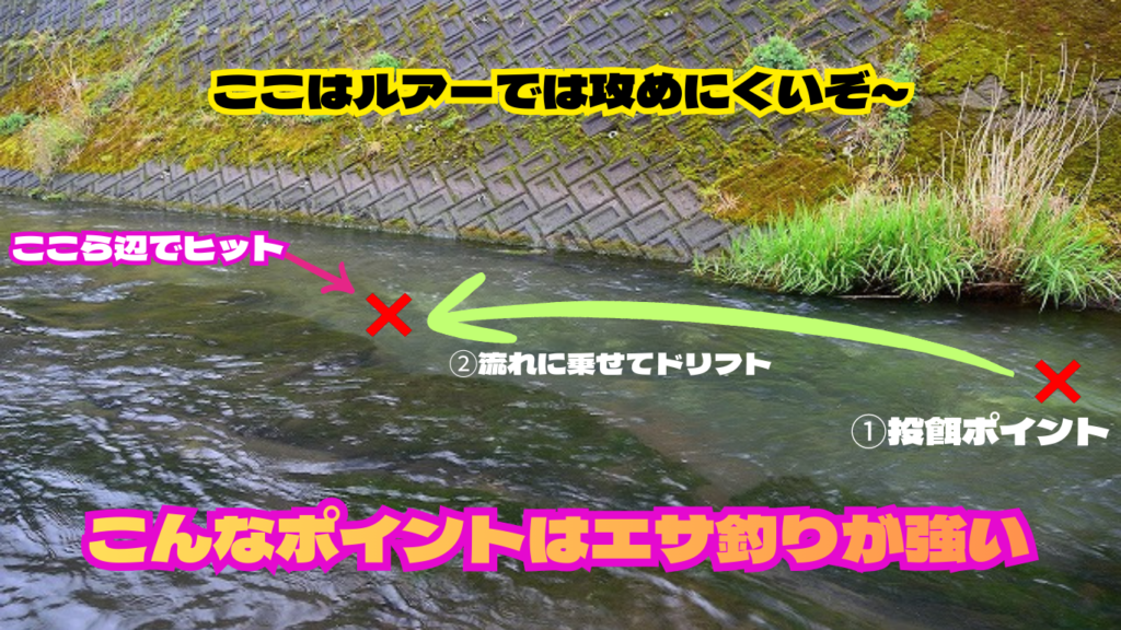 でもエサ釣りだったら①のポイントにエサを静かに着水させてなじませ、流れに乗せてゆっくり下流に送り込んでいくだけの簡単作業